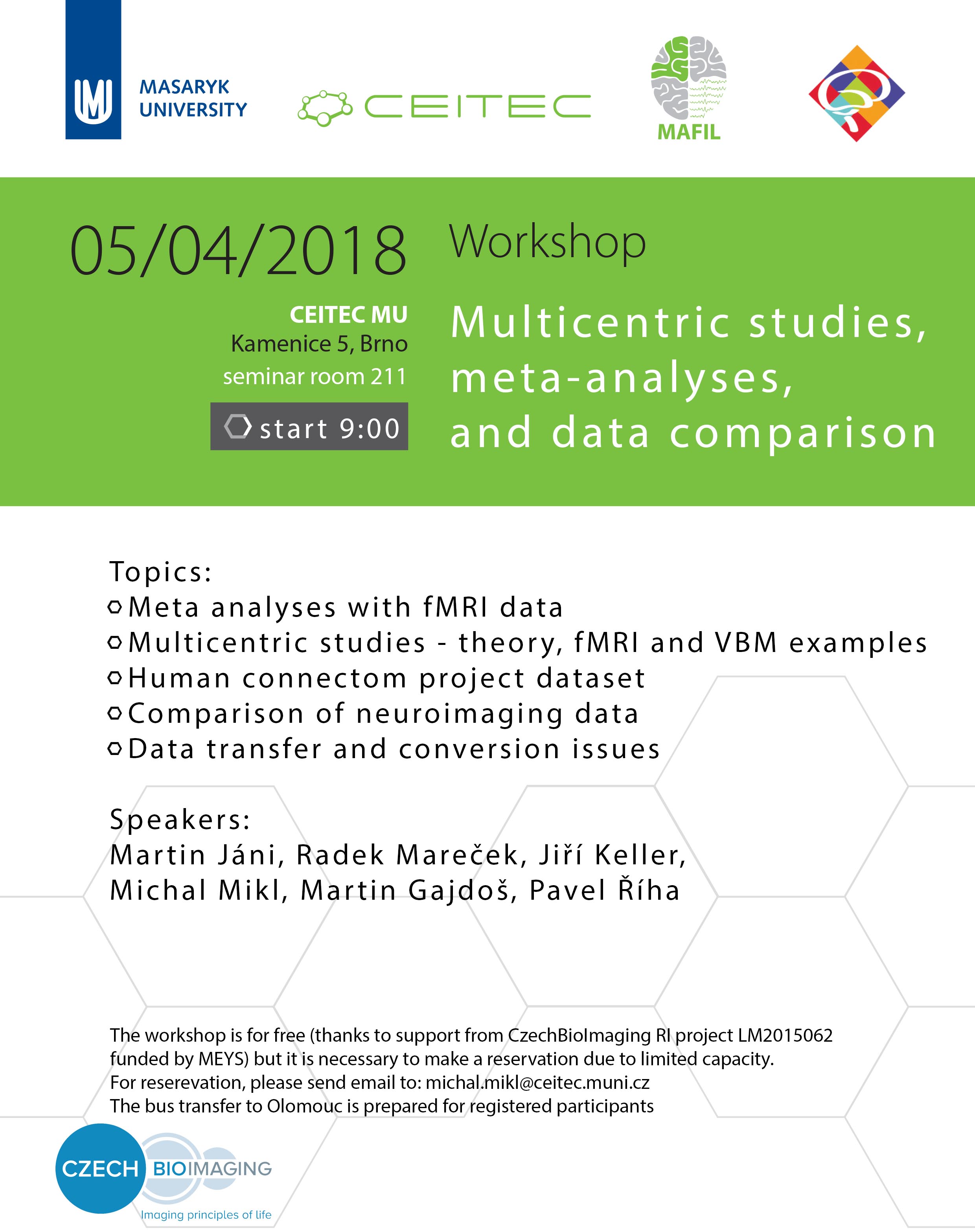 dovolte mi, pozvat vás i všechny další příznivce funkcčního mapování opět na náš dopolední workshop, který předchází olomoucké akci. Datum je tedy 5.4.2018 (čtvrtek). Téma je letos Multicentrické studie, meta-analýza, porovnatelsnost a přenos dat mezi přístoji a pracovišti a vše s tím související. Tradičně akce proběhne v budově CEITEC (budova A35, univerzitní kampus Brno - Bohunice, vchod z ulice Studentská) od 9:00. Pro nahlášené účastníky, kteří projeví zájem bude mžosnot zajištění dopravy do Olomouce mikrobusem, stejně jako v minulých letech.